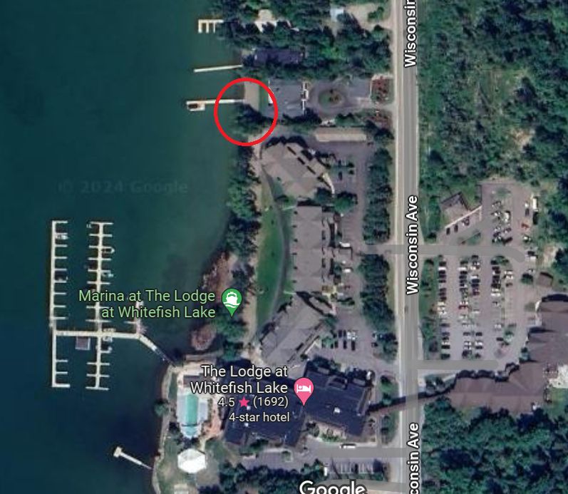 The Wyze treasure was found next to “The Lodge at Whitefish Lake”. Down below is the lake. You can see the location of the lodge labeled with a red marker on the bottom right.