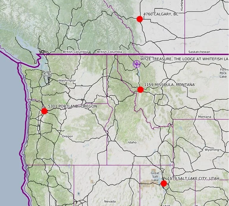This data was plotted after all of the remote viewing data was turned in. It depicts the 4 reference locations and the actual target location of the Wyze treasure, found to be at “The Lodge at Whitefish Lake”, Montana. The location is depicted in purple.